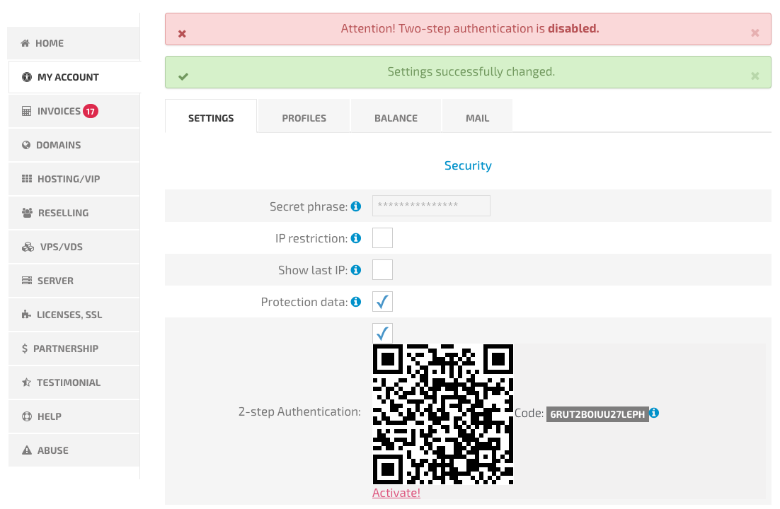 Then go to the Billing panel => Section “MY ACCOUNT” => “SETTINGS”, set the checkbox “Two-step authentication :, SAVE